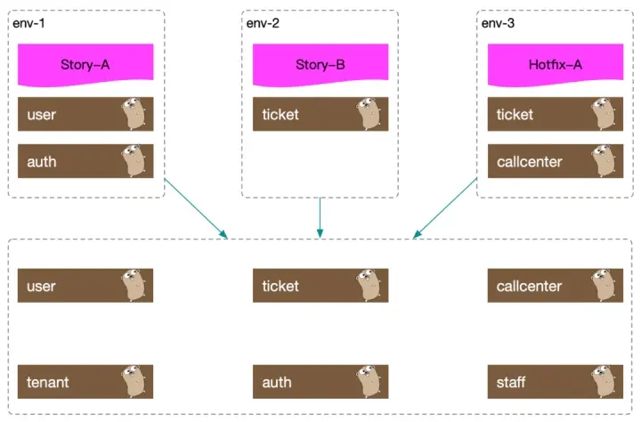 细想一下,其实问题的根源是大家共用一套测试环境,所以我们的研发活动出现了资源竞争,我们对某个服务的操作可能影响到其他服务。
