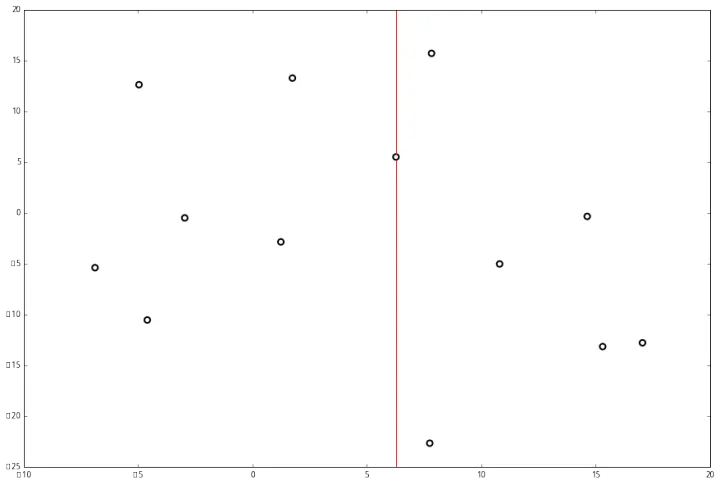 首先先沿 x 坐标进行切分,我们选出 x 坐标的中位点,获取最根部节点的坐标