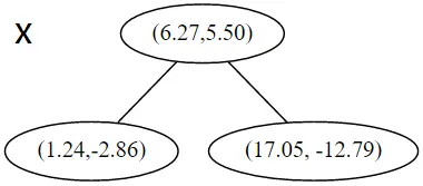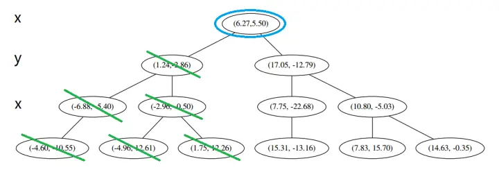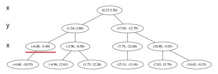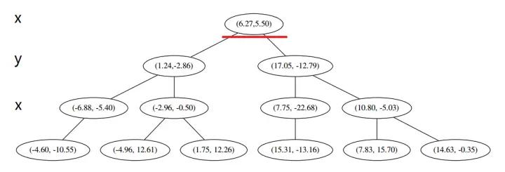 并且按照该点的x坐标将空间进行切分,所有 x 坐标小于 6.27 的数据用于构建左分支,x坐标大于 6.27 的点用于构建右分支。