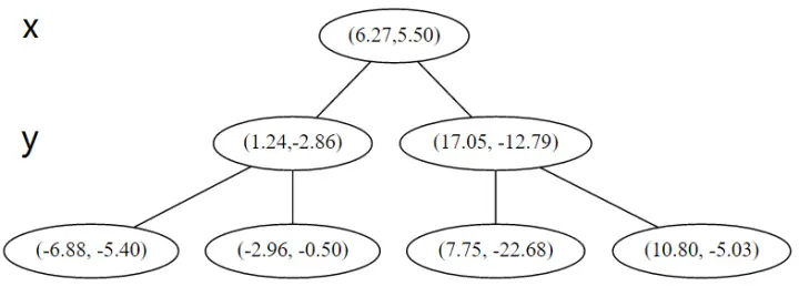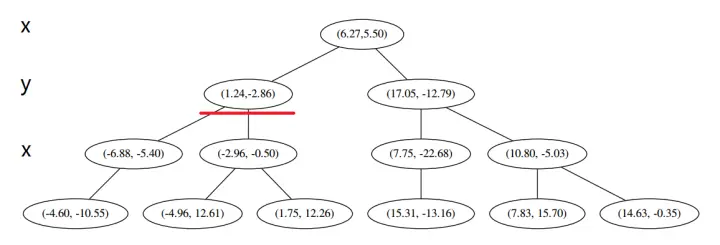 在下一步中 ,对应 y 轴,左右两边再按照 y 轴的排序进行切分,中位点记载于左右枝的节点。得到下面的树,左边的 x 是指这该层的节点都是沿 x 轴进行分割的。