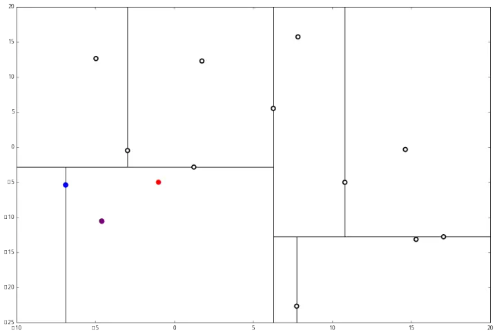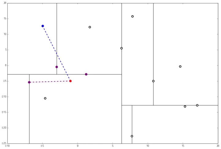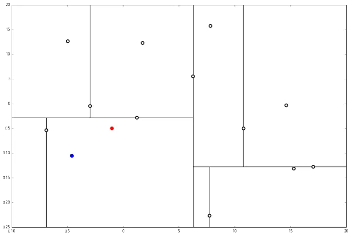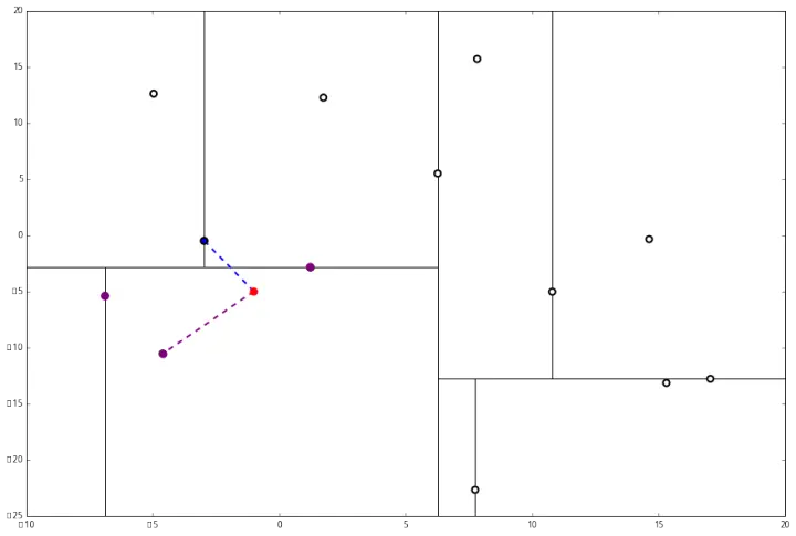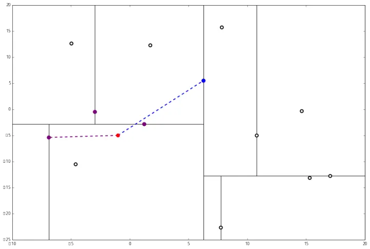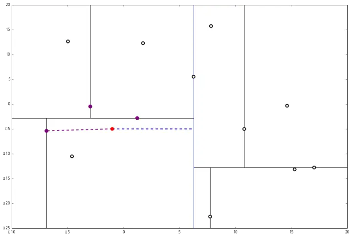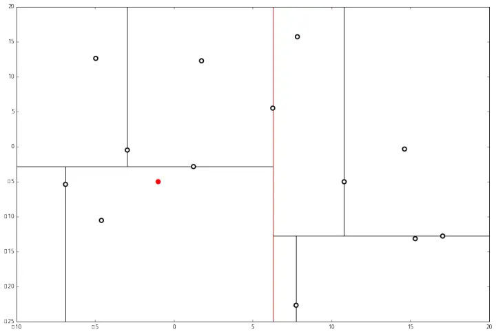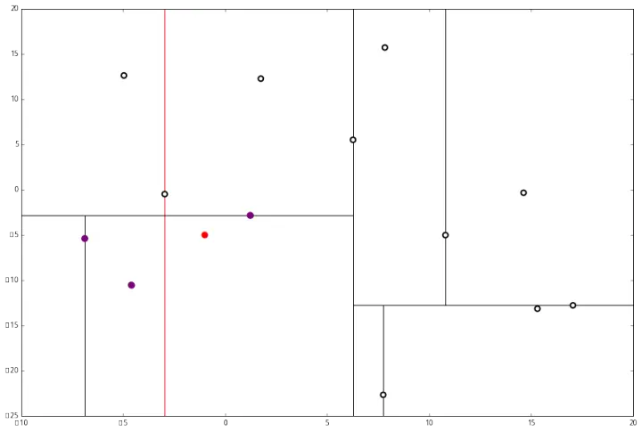 因此,在分割线的另一端可能有更近的点。于是我们在当前结点的另一个分枝从头执行步骤1。好,我们在红线这里: