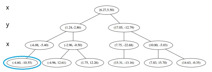 执行 3a,因为我们记录下的点只有一个,小于 k=3,所以也将当前节点记录下,插入到nearest[ ]集合中,有 L=[(−4.6,−10.55),(−6.88,−5.4)].。 因为当前节点的左枝是空的,所以直接跳过,如何继续回退,不是顶部, 又往上爬了一节。
