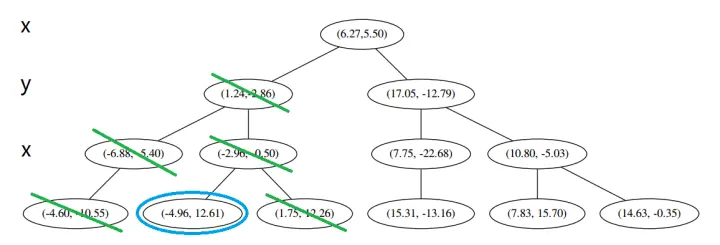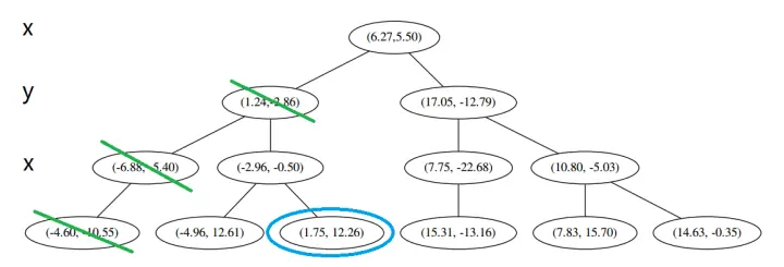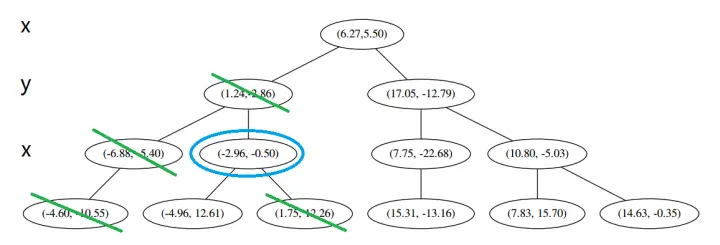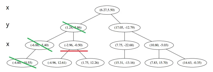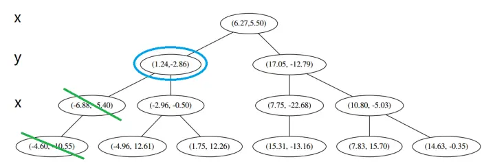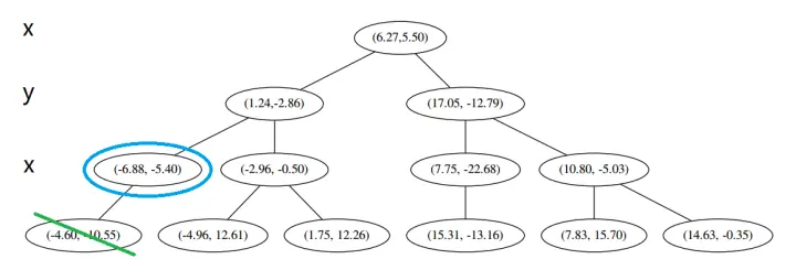 此时我们要执行第二步,将当前结点插入到nearest[ ]中,并记录下 L=[(−4.6,−10.55)]。访问过的节点就在二叉树上显示为被划掉的好了。