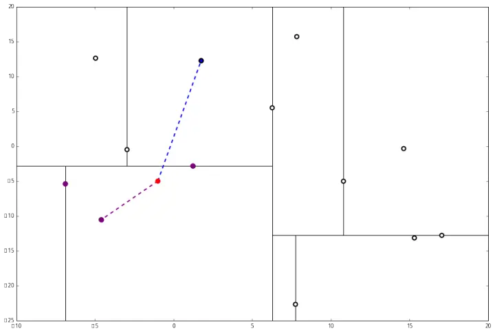- b 目标点到此节点的分割线垂直的距离为d,判断nearest[ ]中距离最大的点与 d 相比较,如果比d大,说明d的另一侧区域中有可能有比nearest[ ]中距离要小,因此需要查看d的左右两个子节点的距离。 如果nearest[ ]中距离最大的点比 d小,那说明另一侧区域的点距离目标点的距离都比d大,因此不用查找了,继续向上回退。
