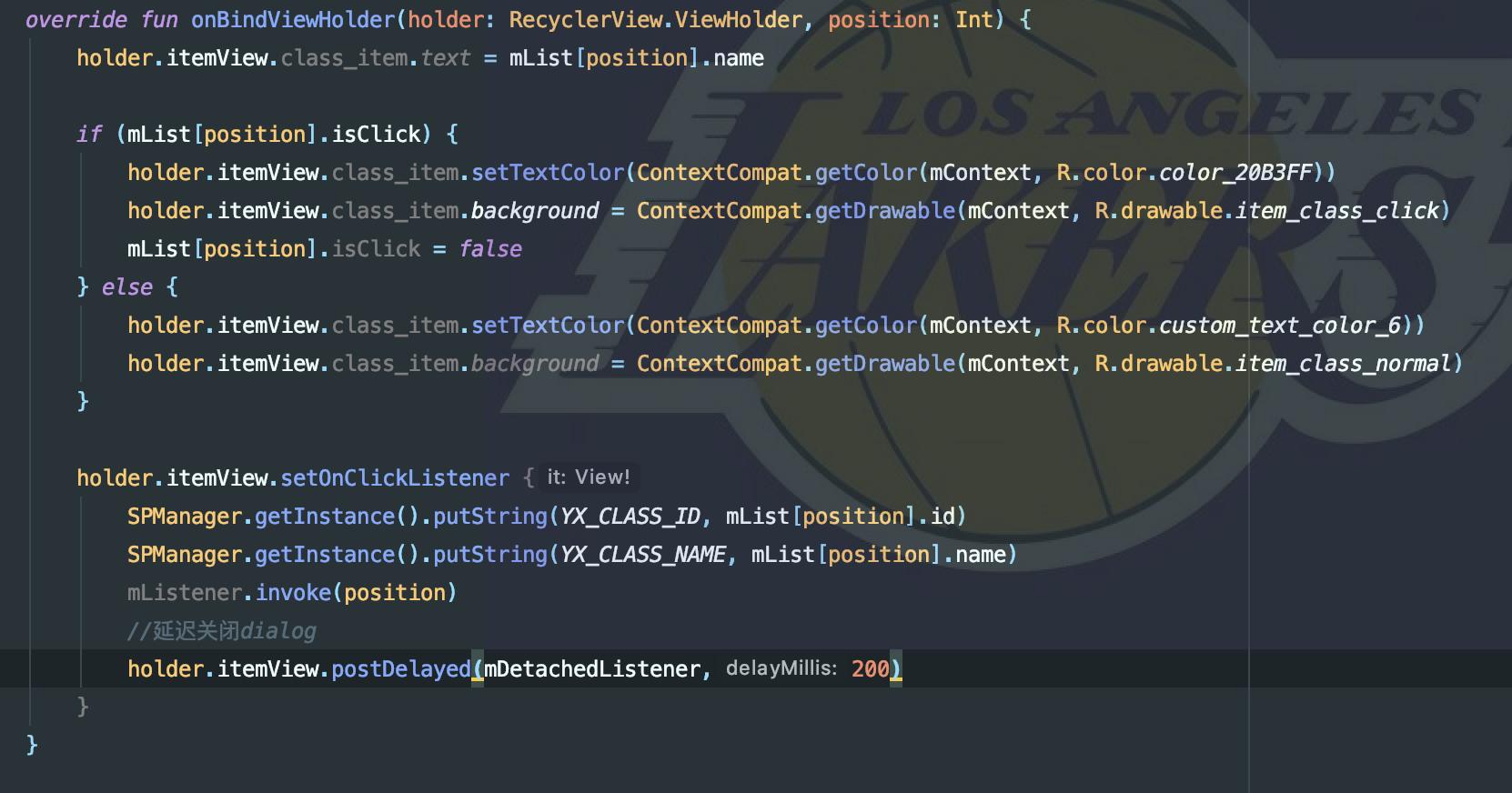 大家可以看到最后一行代码,这是另外一个坑。当时我写完之后发现点击item,然后dialog跟着消失但是点击的item没有点击效果啊。研究之后我发现是dialog消失的时间太快了,item还没展示点击效果dialog就消失了,又或者是在dialog消失过程中才出现点击效果,这样肉眼是看不到的,所以后面就让dialog延迟消失,完美解决。至于以上这个问题,估计跟添加了判断和调用了notifyDataSetChanged() 导致了速度变慢吧跟不上dialog dimiss()的速度吧。