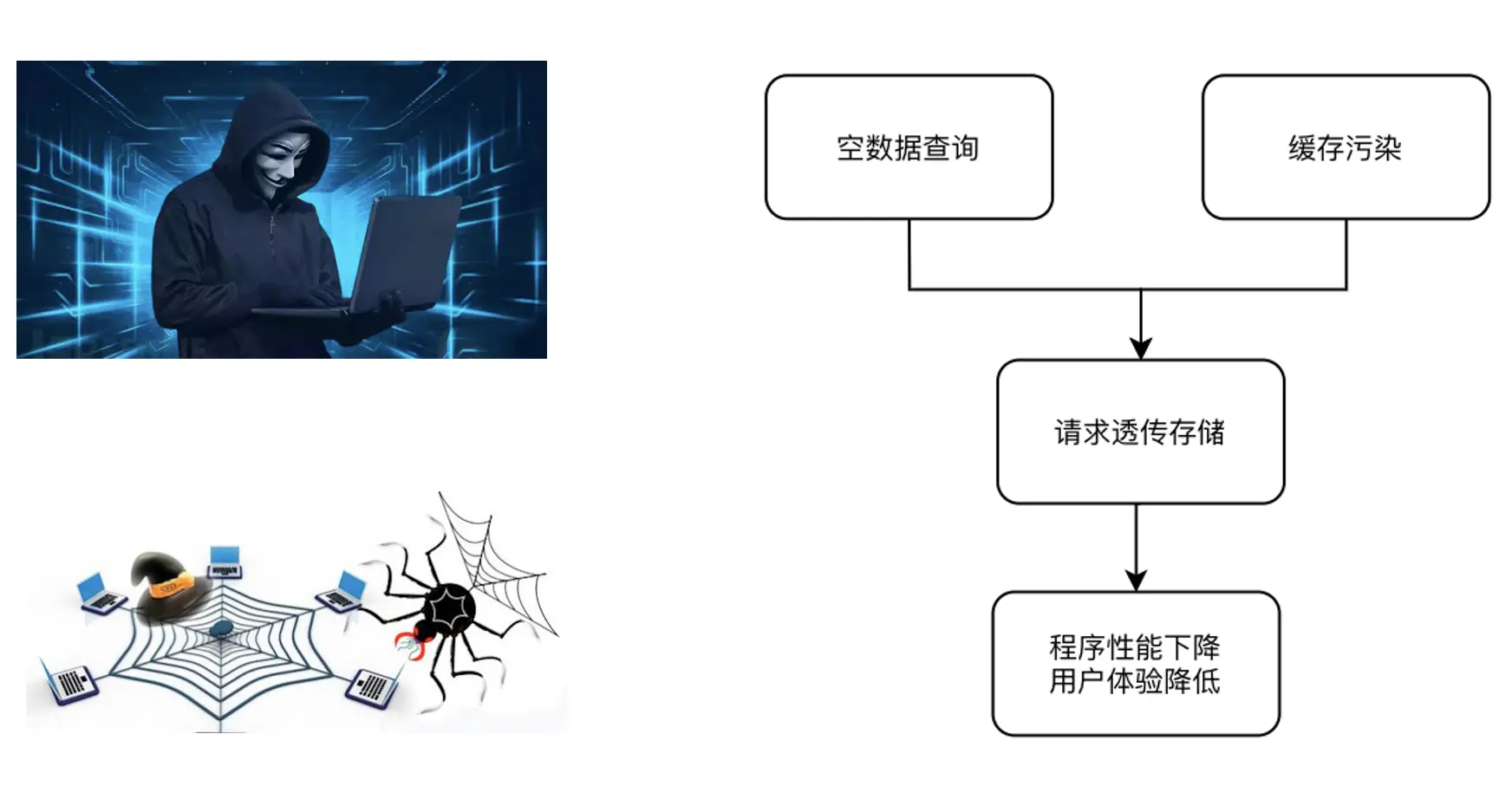 缓存击穿是指查询请求没有在缓存层命中而将查询透传到存储DB的问题,当大量的请求发生缓存击穿时,将给存储DB带来极大的访问压力,甚至导致DB过载拒绝服务。空数据查询(黑客攻击)和缓存污染(网络爬虫)是常见的引发缓存击穿的原因。
