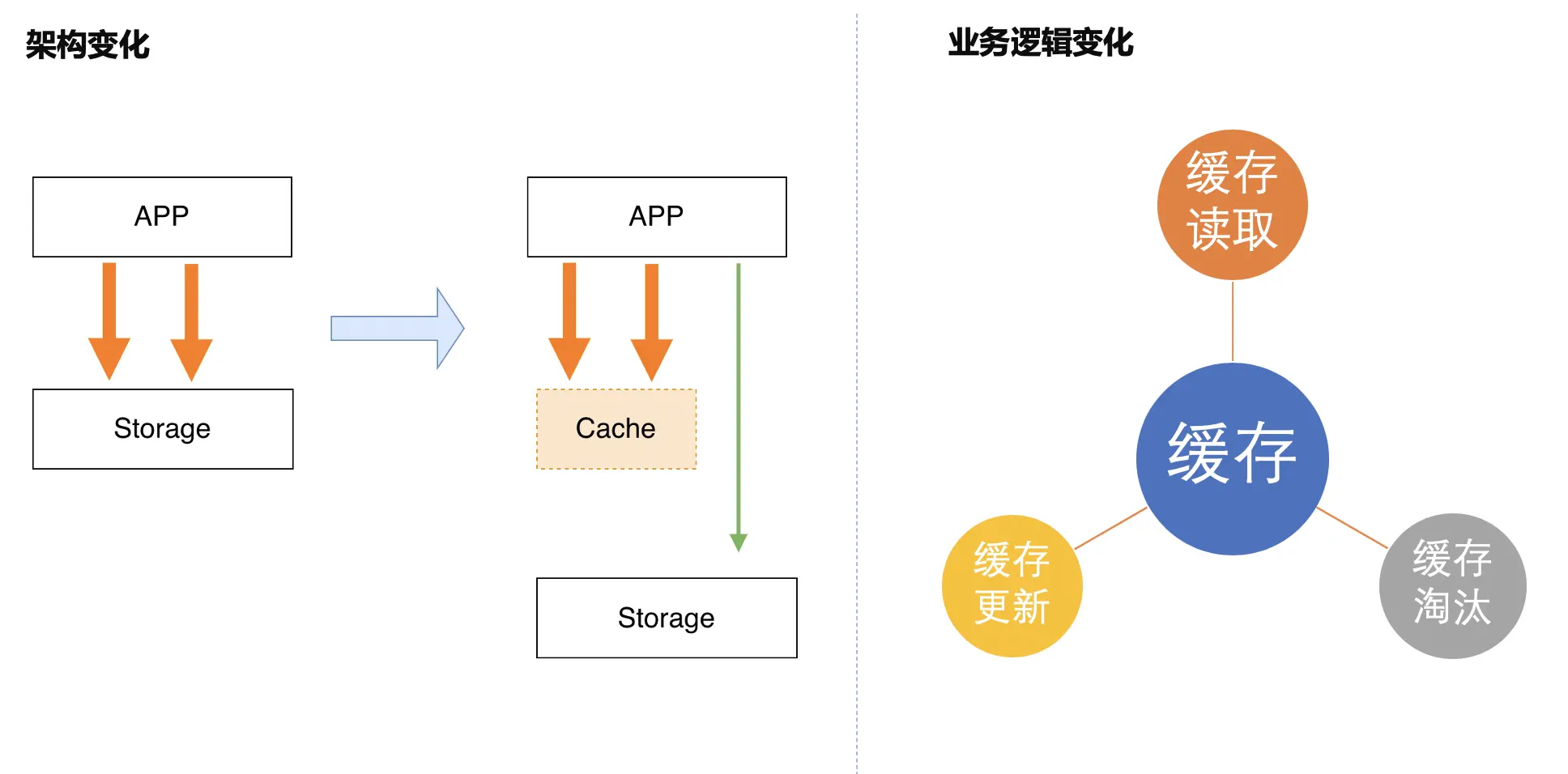 在引入分布式缓存后,我们的业务架构由原有两层架构(应用+数据库)变成了三层架构(应用+缓存+存储),缓存层缓存热数据,存储层负责全量数据持久化存储。