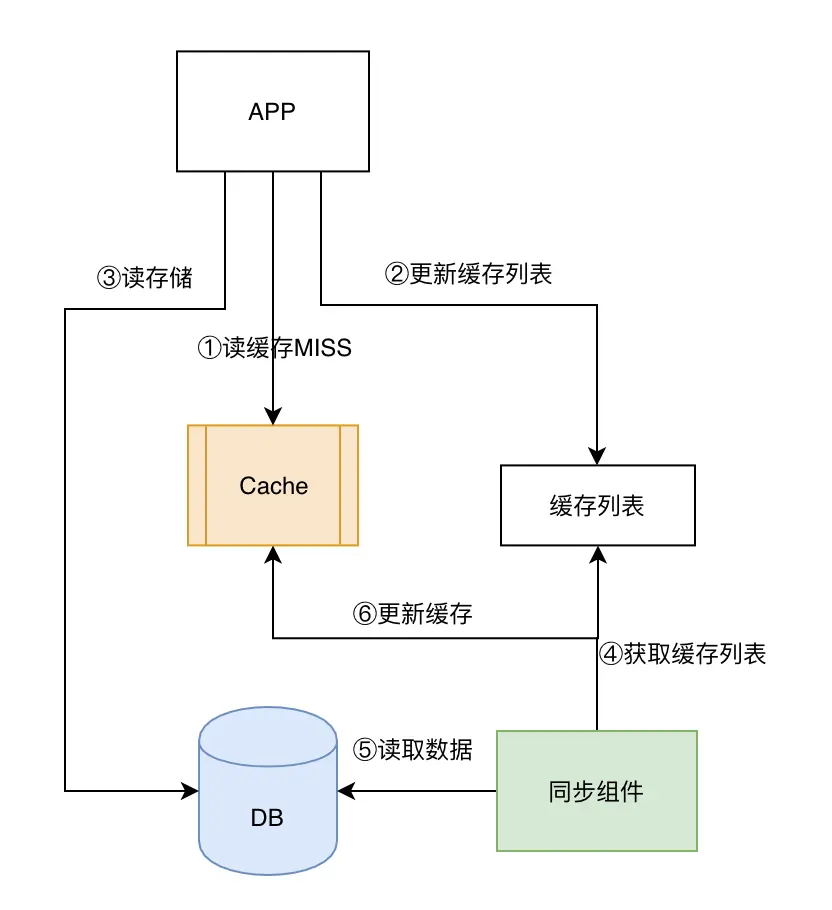 在通过第三方组件更新的方案中,为了保障数据的一致性,避免对单条数据的并行更新,缓存的所有更新操作都需要交给同步组件,因此缓存MISS场景下的逻辑