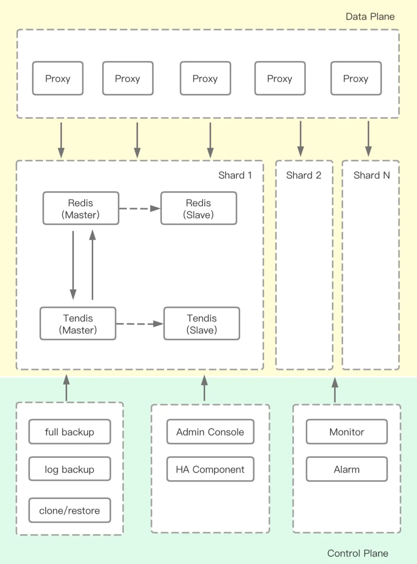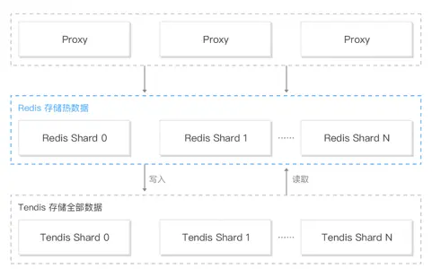 Redis混合存储版架构核心组件由Proxy、缓存Redis、存储Tendis组成,其中每个组件的功能介绍如下: