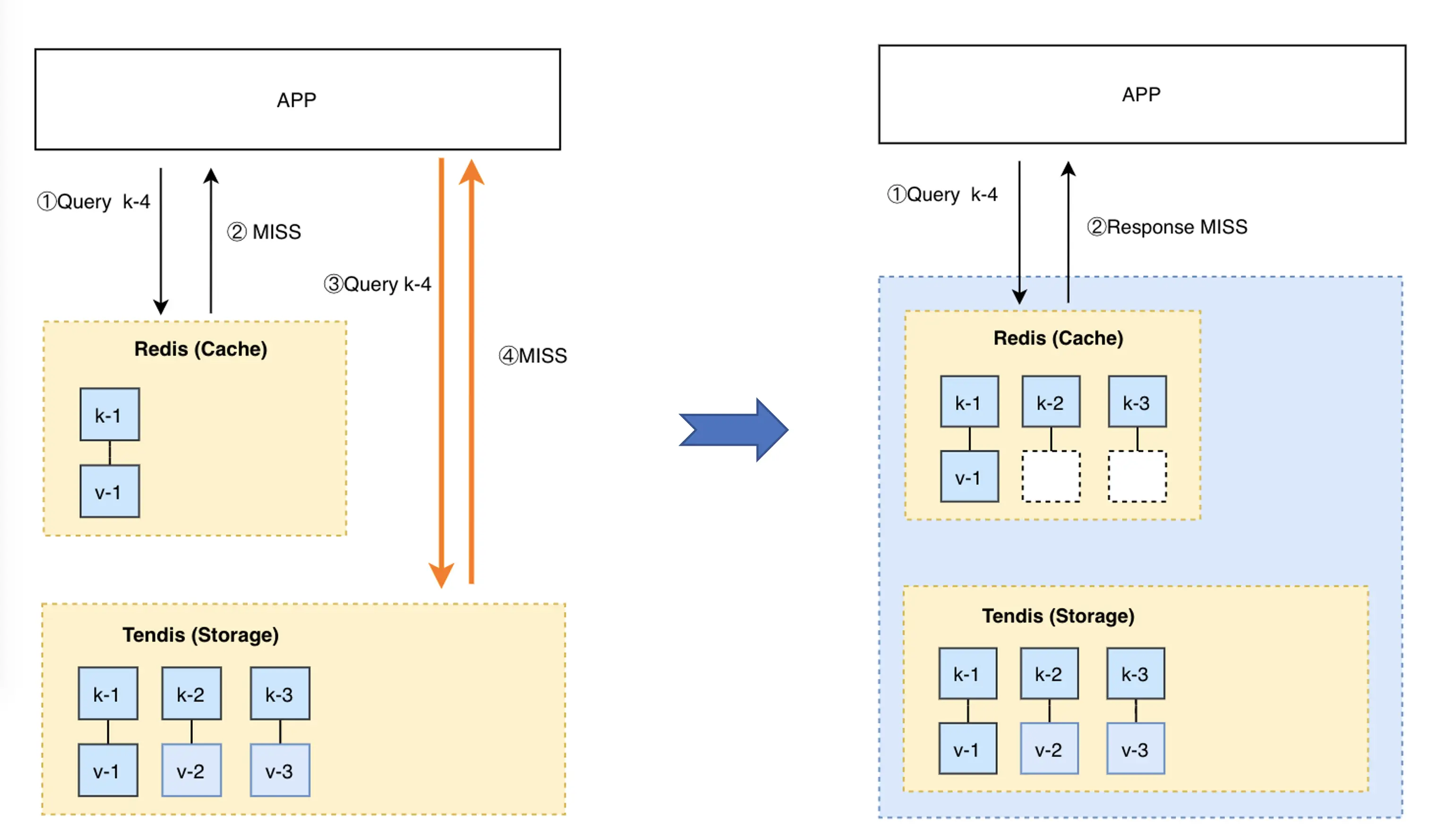 第二:一个冷Key瞬间产生大量的访问,由于缓存MISS导致大量请求透传到存储层,Redis混合存储版通过合并冷数据缓存的请求,同一个key的请求只访问一次存储层(Ten第三),可以将对存储层的访问降到最低,从而避免存储层过载。