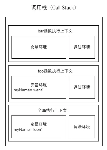 在 foo 函数和全局环境中都定义了同名变量 myName ,那么执行 foo 函数之后应该打印哪个 myName 的值呢,看过前面几篇文章的同学一定已经知道如何通过执行上下文的进栈和出栈分析这段代码的执行过程,当执行到第6行的时候,这时候的调用栈是下面这样: