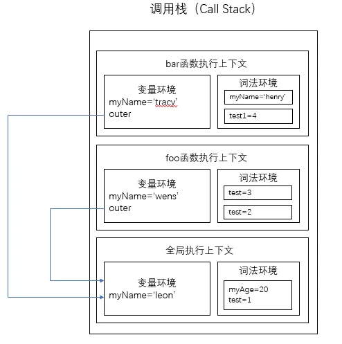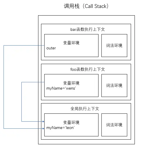 当一段代码使用了一个变量时,JavaScript 引擎首先会在“当前的执行上下文”中查找该变量,比如上面那段代码在查找 myName 变量时,如果在当前的变量环境中没有查找到,那么 JavaScript 引擎会继续在 outer 所指向的执行上下文中查找。具体我们看下面这张图: