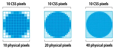 首先需要分清不同类型的像素:CSS 像素和设备像素。 单个 CSS 像素可能包含多个设备像素。例如,单个 CSS 像素可能直接对应于单个设备像素,也可能依托于多个设备像素。 这是什么意思?那就是,设备像素越多,屏幕上所显示内容的细节就越丰富。