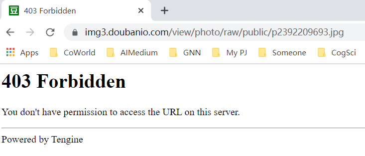在下载图片时,发现可以直接访问图片的缩略图url进行下载,但由于豆瓣的反爬策略,直接访问原图url会被服务器拒绝,见下图。解决方法见下一部分。