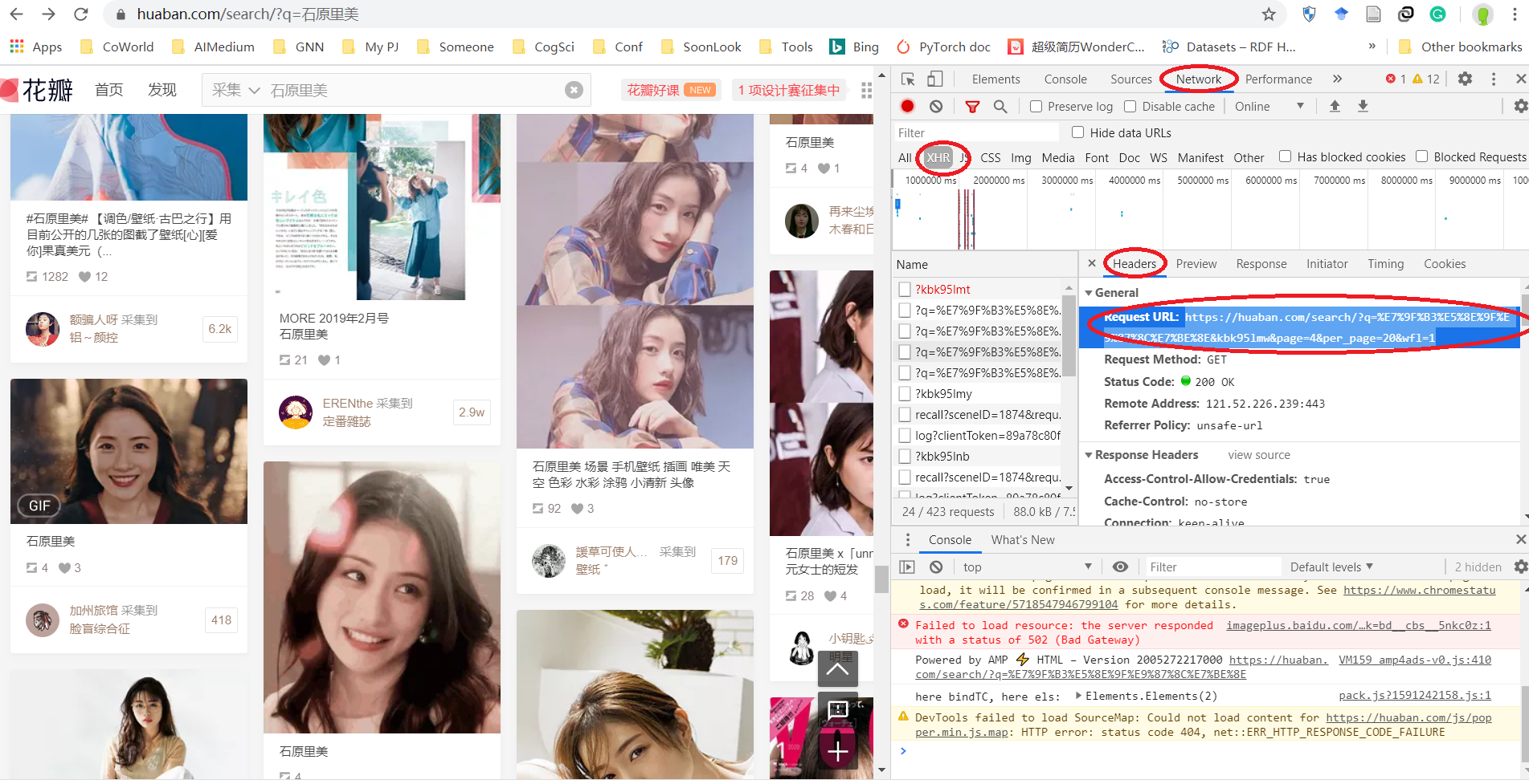 另外可以通过分析页面,找到请求借口,加载页面。其核心就是跟踪页面的交互行为 JS 触发调度,分析出有价值、有意义的核心调用(一般都是通过 JS 发起一个 HTTP 请求),然后我们使用 Python 直接访问逆向到的链接获取价值数据。通过"F12”进行分析,例如对于花瓣网,可以获得其链接为"huaban.com/search/?q=石…