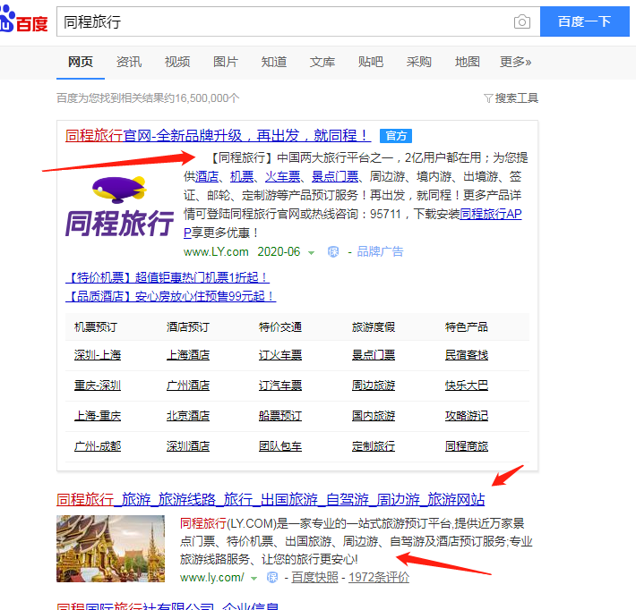 再例如当我们搜索关键字“专业的一站式旅游预订平台”的时候搜索结果会显示我们同程以及携程的信息。这时候因为网站meta标签使用中包含 keywords和description内都有包含其中的一站式,旅游预定平台等相关字眼。