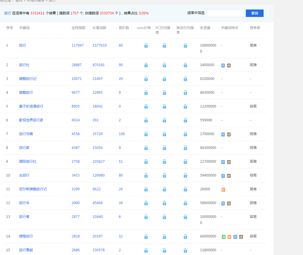 在实际工作中,推荐使用一些关键字工具来挑选,比如 Google Trends、站长工具。 下图我们使用站长工具搜索 “旅行”关键字得到的结果,可以看到得到了相关关键字的一些信息。比如全网搜索指数、关键词特点。