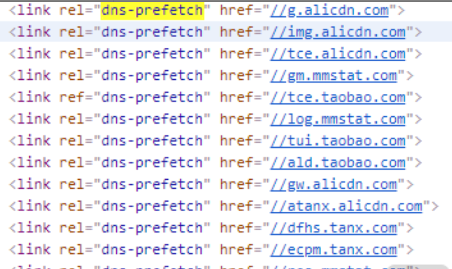 - dns-prefetch 当 link 标签的 rel 属性值为“dns-prefetch”时,浏览器会对某个域名预先进行 DNS 解析并缓存。这样,当浏览器在请求同域名资源的时候,能省去从域名查询 IP 的过程,从而减少时间损耗。下图是淘宝网设置的 DNS 预解析。