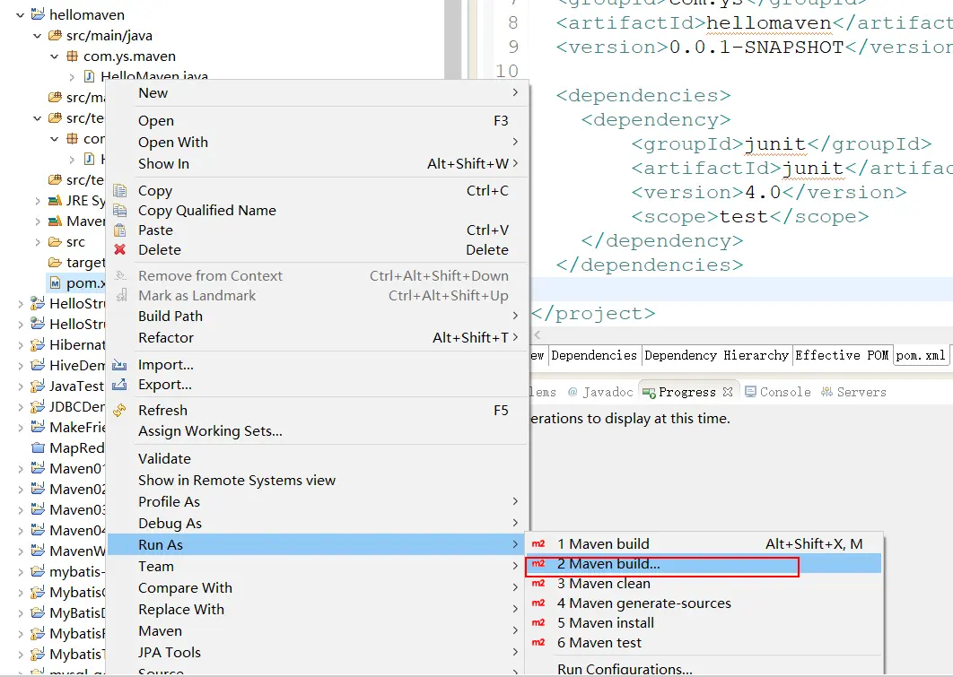 第一步:选择 pom.xml 文件,右键--->Run As ---->2 Maven build...,然后在弹出框中输入 test 或者选择 pom.xml 文件,右键--->Run As------>6 Maven test,如下图