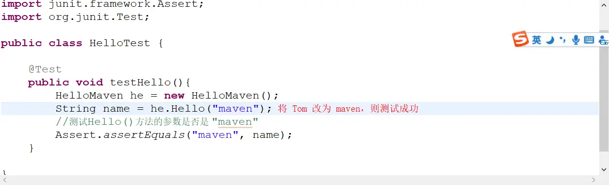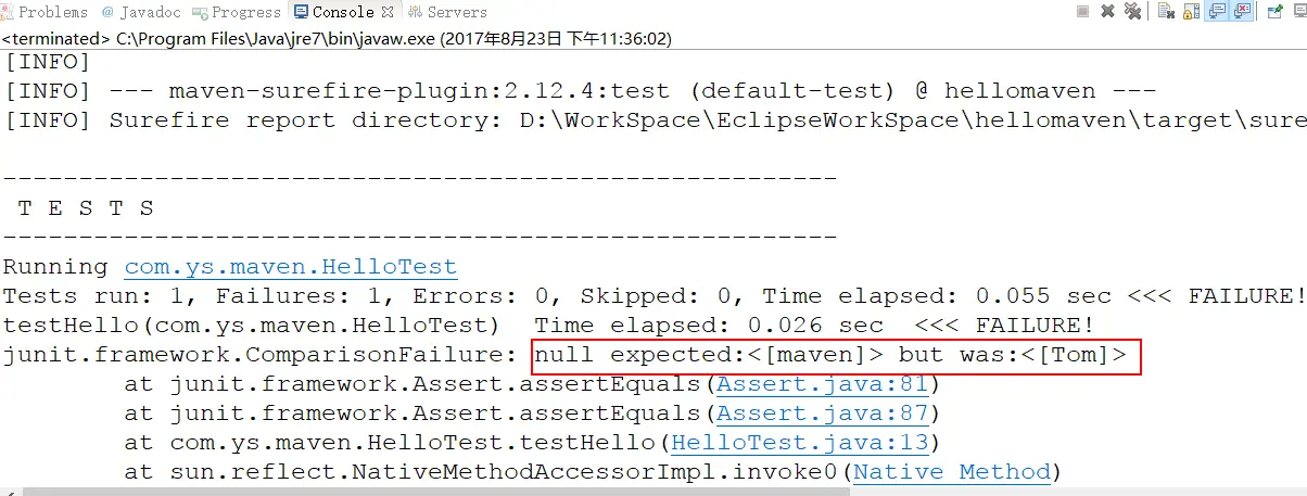 分析测试程序,我们传入的参数是Tom,而我们希望的是maven,很显然是不相等的,那么测试失败