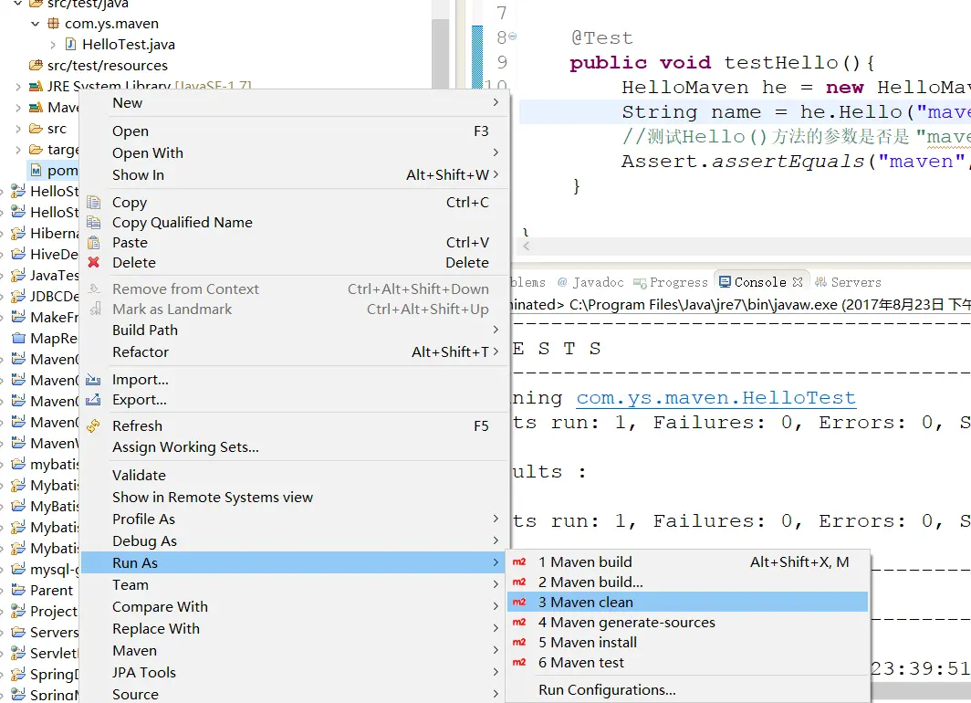 第一步:选择 pom.xml 文件,右键--->Run As ---->2 Maven build...,然后在弹出框中输入 clean 或者选择 pom.xml 文件,右键--->Run As------>3 Maven clean,如下图