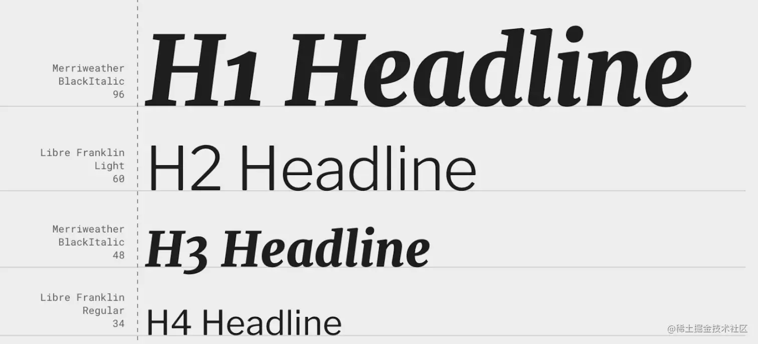 Material 定义 了一种类型比例——您应该在整个应用中使用的离散文本样式集,它们作为一个主题属性(textAppearance) 被提供。使用 Material type scale generator 帮助生成不同字体的比例