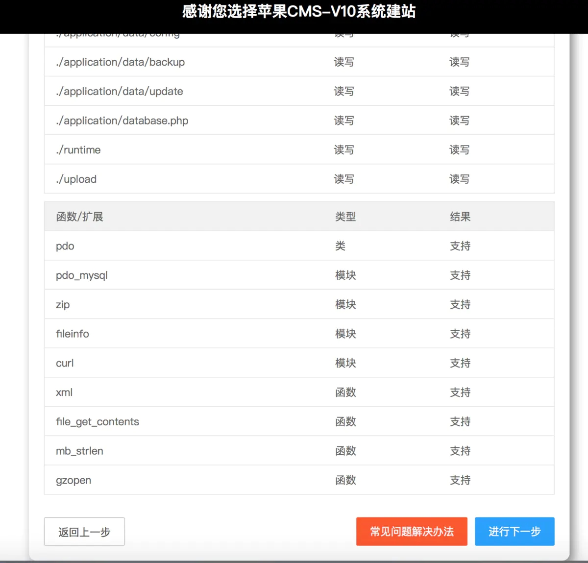 然后,点击“同意协议并安装系统”,此时进入下面的环境监测界面。安装程序会检查一下你的vps上所安装的插件是否符合苹果CMS的要求,只有符合要求时,苹果CMS才能正常运行,因此这一步的检测是必要的。