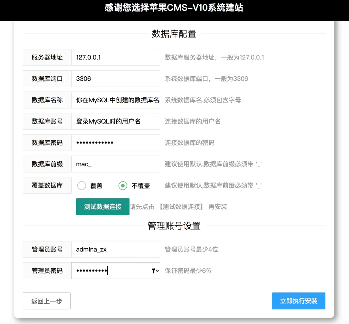 下面的管理员账号密码是你日后用来登录苹果CMS后台时所需的用户名和密码,请设置一个足够长,并且足够安全的密码并牢记它。