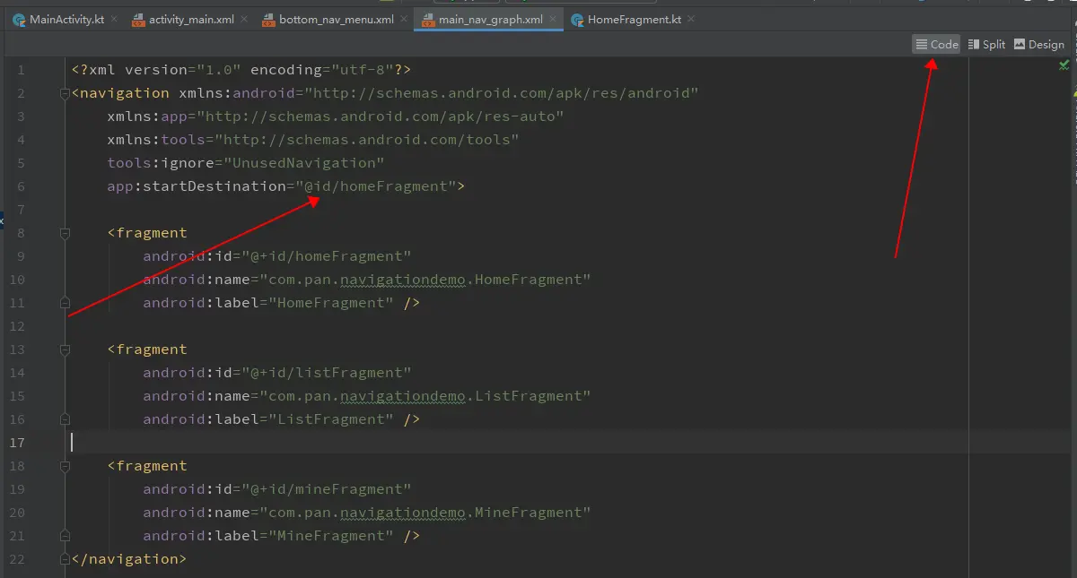 切换Code视图代码自动添加成如下 注意 startDestination 默认第一个