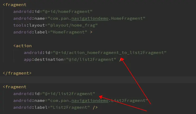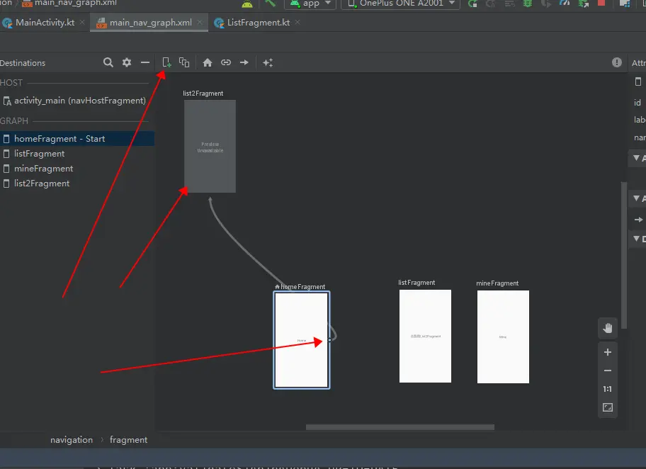 1.进入nav_graph.xml 导航视图文件,把要跳转的fragment加入进来 然后在homefragment 右侧拖动箭头指向要跳转的fragment.切到code视图xml如下