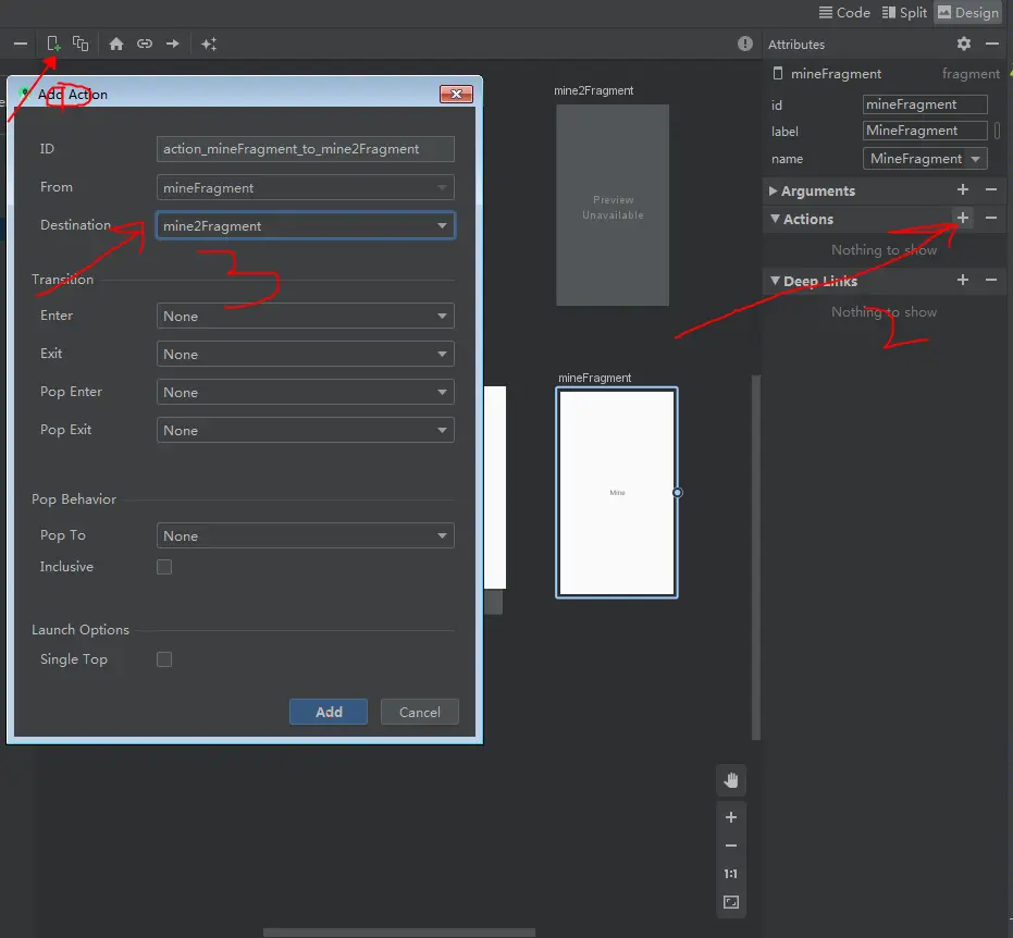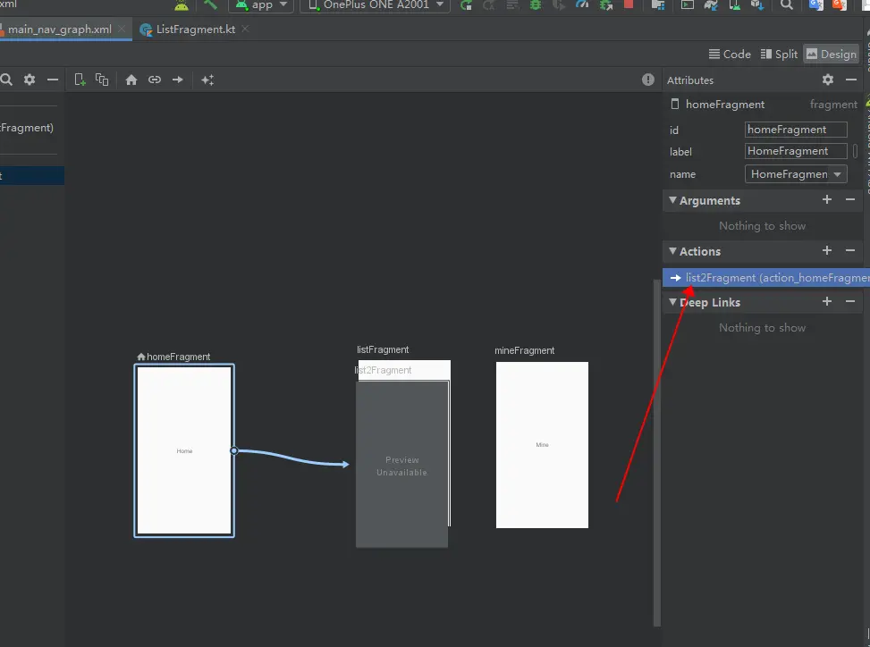 会发现导航fragment里多了action标签指向目的地fragment.同时我们在切换Design会发现action已经有内容了