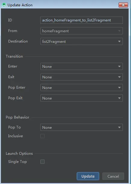 既然如此 我们试着直接点击action添加试试看 首先我们新建Mine2Fragment 然后点击加号 NEW Destination.点击导航fragment Actions 在Destinations找到我们刚才添加进来的目的地fragment选中 之后Id 会自动帮我们填上.同时我们会发现我们可以设置转场动画 启动方式等。感兴趣的可以自己试试 跳转代码 findNavController().navigate(R.id.list2Fragment) 具体见demo