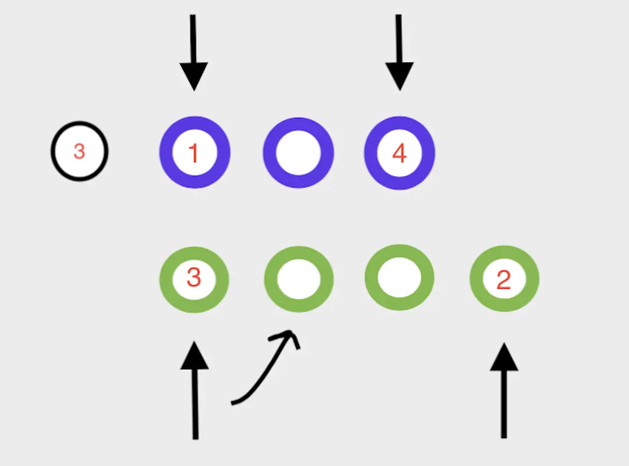 当头和头,尾和尾都不同时,先比较旧树的头和新树的尾,如果相同,就把旧树的头指针指向的节点移动到尾指针指向节点的后面。旧头指针后移,新尾指针前移。