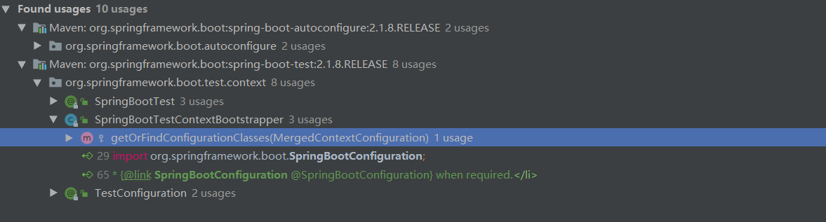 从文档注释以及它的声明上可以看出,它被 @Configuration 标注,说明它实际上是标注配置类的,而且是标注主启动类的。被 @Configuration标注的类,会被 Spring 的IOC容器认定为配置类。相当于一个 applicationContext.xml 的配置文件。 此外,@SpringBootConfiguration还有一个作用,我们用IDEA的find Usages功能可以看到他还与Springboot的test包有关,没错。 getOrFindConfigurationClasses这个方法就是Spring测试框架搜索主启动类用的,这里就不过多阐述了。