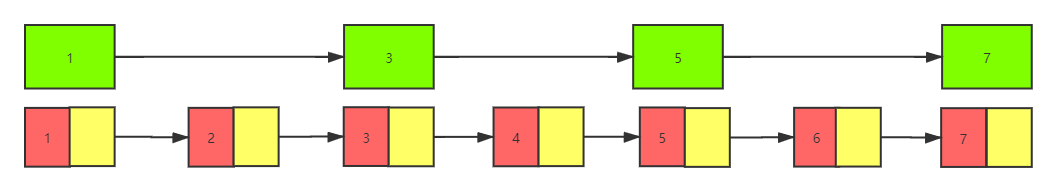 我们可以在链表中抽取部分节点,下图抽取了1,3,5,7四个节点,也就是每两个节点提取了一个节点到上级,抽取出来的叫做索引。