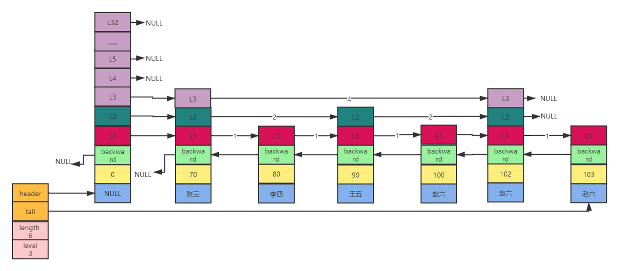 这样说太抽象了。拿上图举个例子,从表头的level即3开始,首先到张三的L3,发现分数70,比目标分数101小跳过,根据其前指针找到赵六的L3,发现分数102,比目标分数101大,将赵六L3记录在待更新数组update中,同时记录跨度span为4。接着到下一层,张三的L2层,发现分数70比目标分数101小跳过,根据前指针找到王五的L2,发现分数90,比目标分数101小跳过,根据前指针找到赵六的L2,发现分数102比目标分数101大,将赵六的L2记录到待更新数组update中,同时记录跨度span为2。最后到下一层,张三的L1层,逻辑和刚才一样的,也是记录赵六的L1层和跨度span为1。