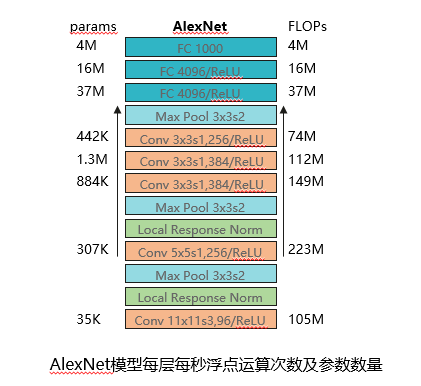 说起AI业务,就不得不提最经典的AlexNet。AlexNet模型于2012年提出,其被认为是计算机视觉领域最有影响力的模型之一。AlexNet网络主要包含八层,前五层是卷积层,最后三层是全连接层。 配合pooling及norm运算,以下列出所有卷积层和全连接层的参数规模以及每层的浮点计算量,从图中可以看出AlexNet网络的参数规模达到了6千万量级,计算量达到720MFlops。通过在横向比较几个经典的分类网络,参数规模以及计算量都是巨大的。那么从计算量的角度来看计算中99%以上都是卷积运算,本质都是矩阵运算。