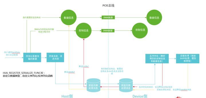 通过DMA(Direct Memory Access)映射将控制信息拷贝一份存放到对端的内存中,并保持本端与对端之间控制信息的映射关系。 指向数据信息的内存(dataBuf)指针已通过SendData接口的入参传入,dataBuf是由用户调用HIAI_DMalloc/HIAI_DVPP_DMalloc接口申请的,申请该内存后系统将本端的数据信息通过DMA映射拷贝一份存放到对端的内存中,并保持本端与对端之间数据信息的映射关系。