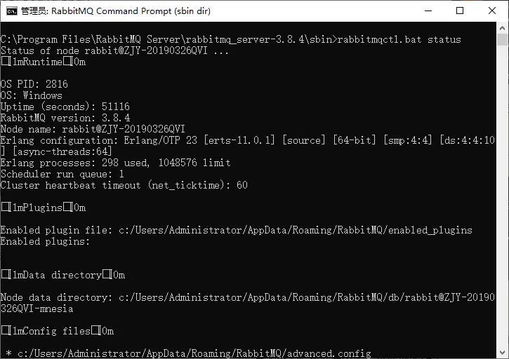 点击「RabbitMQ Command Prompt (sbin dir)」,进入命令行,输入 rabbitmqctl.bat status 可确认 RabbitMQ 的启动状态。