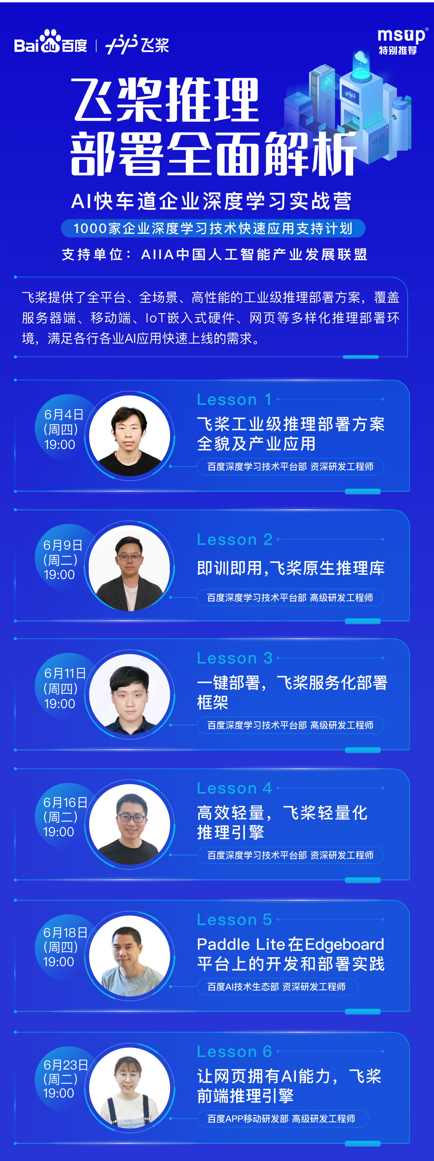 面对一众开发者们的“苦楚”,msup特别推荐百度AI快车道——企业深度学习实战营第二期部署系列专题课程。从6月4日至6月23日课程当天的19:00,每周不同技术主题将在B站,为开发者提供部署方案,带领大家“脱离苦海”。
