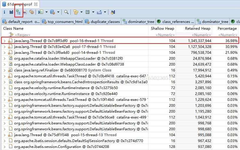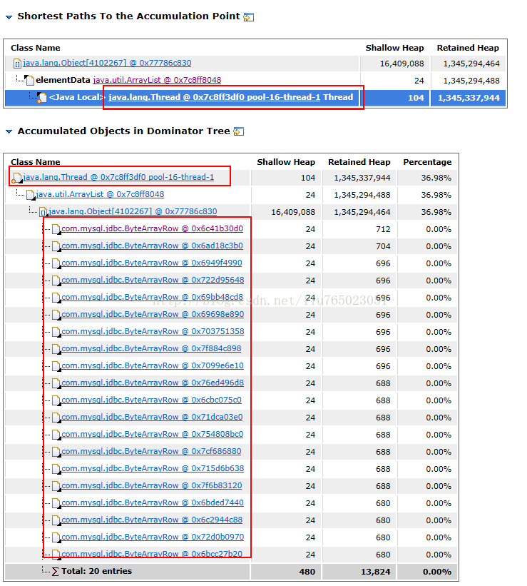 上图显示了一个很明显的有问题的线程:地址是0x7c8ff3df0 ,名称为pool-16-thread-1。 通过《Accumulated Objects in Dominator Tree》视图可以看出,在该线程中,存在一个大的List对象,List对象内存放了大量的mysql的jdbc对象。