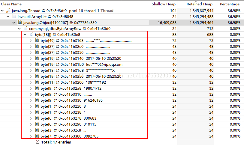 这里的数据,是我们的一张用户表的数据。所以这就可以得出结论:一个线程内,一个list内存放了大量从数据库中获取的用户对象! 想到这里,我们又去看了b、c的问题描述,也是同样的问题。估计是在不同时间点,通过gc已经回收了部分。