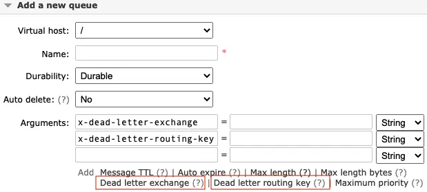 在创建队列时候,设置图中两个参数,一个是绑定死信队列的exchange,一个是绑定死信队列的routing key