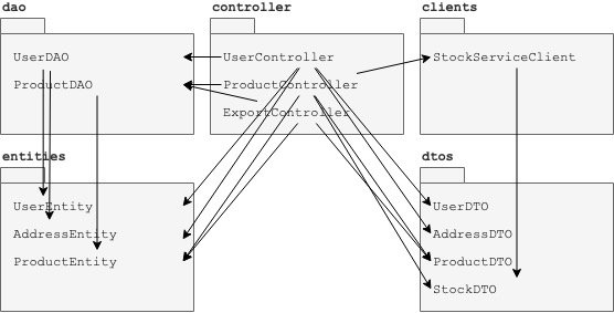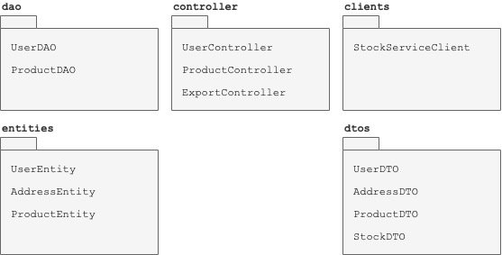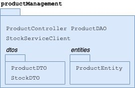 新软件包productManagement包含相同的类类型,以及StockServiceClient和相应的StockDTO。这个事实清楚地表明:库存服务仅由产品管理人员使用。 userManagement和productManagement使用不同的域实体和表。将它们分成不同的包很简单。但是,当一个功能需要与另一个功能相似或甚至相同的域实体时,会发生什么?