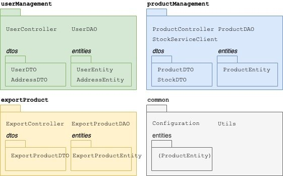 现在,它变得越来越有趣。exportProduct包也处理产品实体,但具有不同的功能用例。 我们的目标是拥有独立自治的功能包。因此,exportProduct应该具有自己的DAO,DTO类和实体类,即使它们看起来与productManagement中的类相似。抵制重用productManagement中的类的冲动。