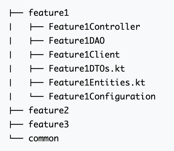 - 这种方法影响所有层。例如,每个程序包都有自己的DAO和客户端。不应有庞大的DAO类神。