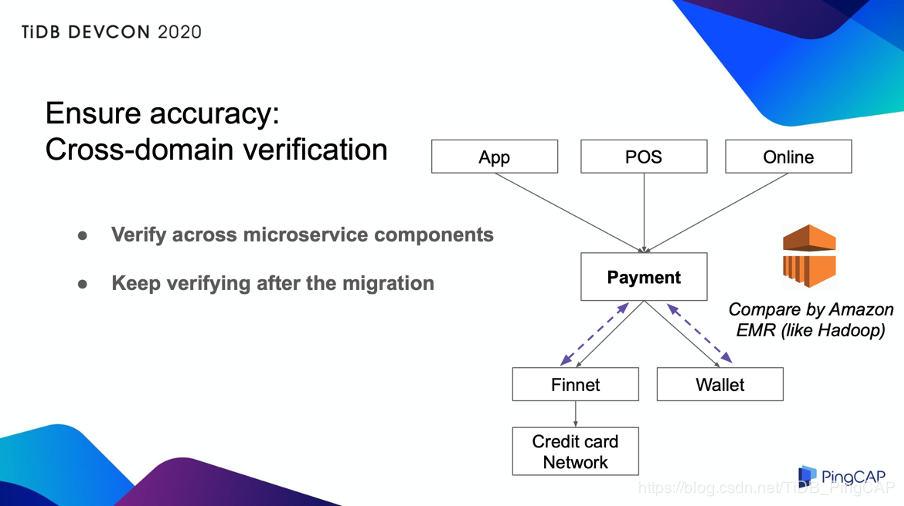 由于我们的系统是微服务,因此我们还在 Payment 和其他相邻组件之间添加了一致性检查。我们使用了Amazon EMR,一种类似 Hadoop 的架构,如下图所示: