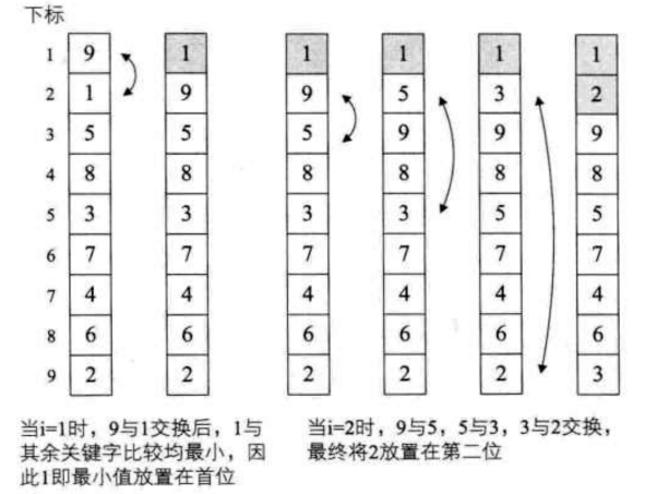 简单排序算法就是通过n-i次关键词比较, 从n-i+1个记录中找出关键字最小的记录, 并和第i(1<=i<=n)个记录进行交换