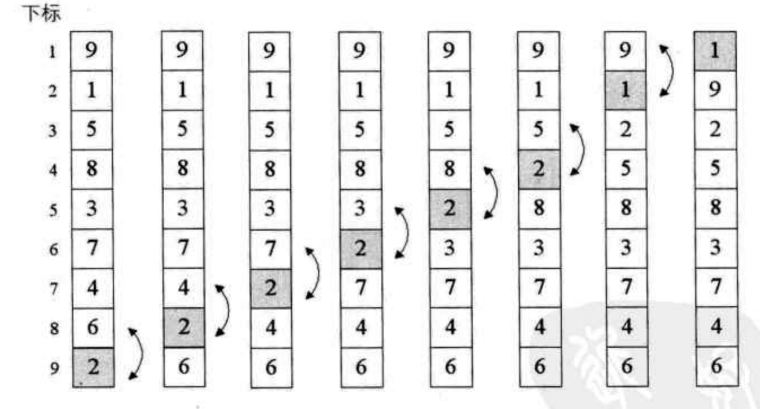 - 此时第一数据为最小, 重新倒序两两比较, 直到到第二个数据