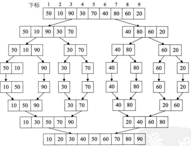 归并排序就是利用归并的思想实现的排序方法. 他的原理是: 假设初始序列为 n 个记录, 则看成 n 个有序的子序列, 每个子序列的长度为1, 然后两两归并, 得到[n/2]个长度为2或1的有序子序列. 再两两归并... 如此重复直到得到一个长度为n的有序序列